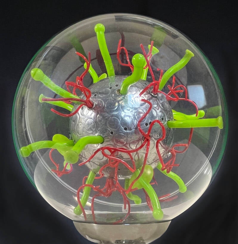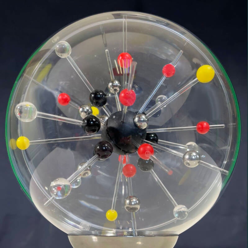 De bol geeft de elektriciteit aan met bijbehorende symbolen en de bliksemschichtjes.