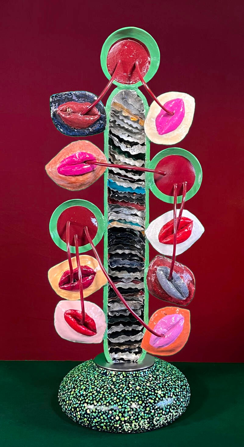 Gemaakt van Takken, electro draad, hout beschilderd met acrylverf met daarop metalen symbolen. Spiegel in het centrum.